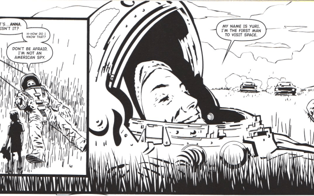 Besides – and to dive into even more obscure comic history for a moment – 2000 AD has already had a Kirbyesque story about Yuri Gagarin with superpowers: Soul Gun Warrior. Shaky Kane’s art style takes Kirby’s style and infuses it with even more bombast and psychedelia, which meshed nicely (if I recall) with an gloriously ridiculous script about the ghost of Yuri Gagarin sabotaging American spaceships. Maybe I should try to dig that story out for the next Yuri’s Night.