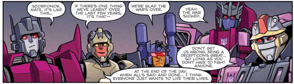In this context Megatron is very much a heroic figure. Initially an obscure miner on the moon of Tarn, writing and distributing poetry in secret, he writes a profoundly influential manifesto that helps coalesce dissidents into the Deception movement. It is only after the war is in full swing that Megatron loses track of the political goals he was fighting for and focuses only on increasingly brutal warfare, transforming him into the archetypal villain of the Transformers franchise. So naturally he is not happy in these comics when he returns to find the war is over; and, gallingly, that Starscream is a more effective leader of Cybertron than he could be. Megatron’s subsequent character arc across the series is one of my favorite aspects of the book.