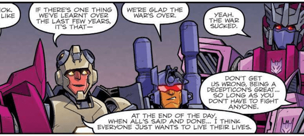 Given how much I love this series, I do want to read more Transformers comics. At some point I’ll try the Simon Furman UK Transformers, as that run is a huge touchstone for British comics creators of a certain age. But I’m not sure anything else is going to feel quite right. After all, Roberts’ run is the one I’m most invested in, and it’s now my definitive view of what Transformers stories can be. For me, the real Transformers franchise is set after the war’s ended, starring a bunch of Autobots and Decepticons looking sheepishly at each other, trying to figure out what to do next.